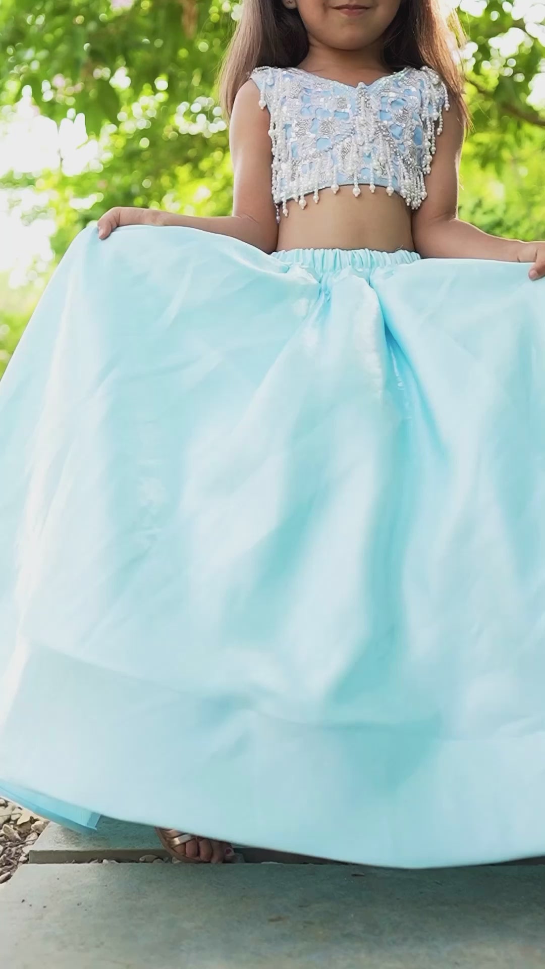 Hand embroidered sky blue satin and organza Lehenga.